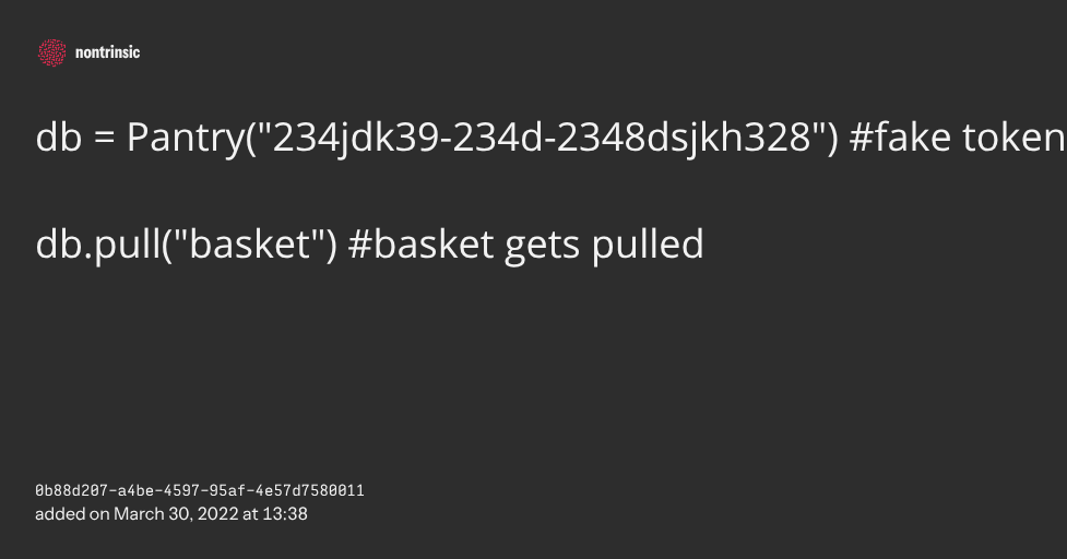 поделитьсяdb = Pantry("234jdk39-234d-2348dsjkh328") #fake token