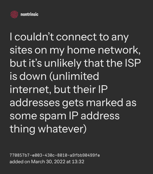 поделитьсяI couldn’t connect to any sites on my home network, but it’s unlikely that the ISP is down (unlimited internet, but their IP addresses gets marked as some spam IP address thing whatever)