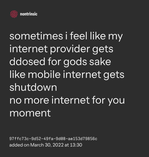 поделитьсяsometimes i feel like my internet provider gets ddosed for gods sake