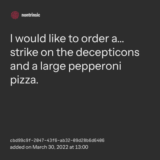 поделитьсяI would like to order a… strike on the decepticons and a large pepperoni pizza.