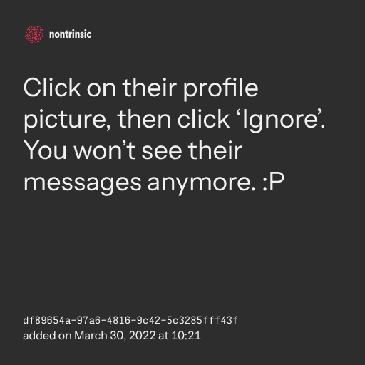 поделитьсяClick on their profile picture, then click ‘Ignore’. You won’t see their messages anymore. :P