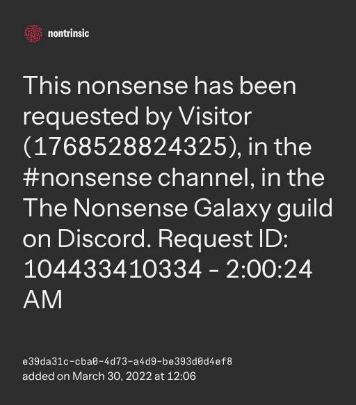 поделитьсяThis nonsense has been requested by Visitor (1768524001630), in the #nonsense channel, in the The Nonsense Galaxy guild on Discord. Request ID: 569825982 - 12:40:01 AM