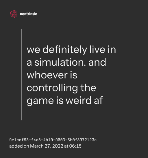 поделитьсяwe definitely live in a simulation. and whoever is controlling the game is weird af