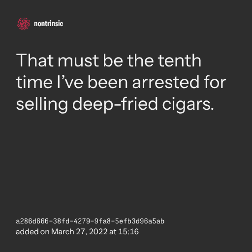 поделитьсяThat must be the tenth time I’ve been arrested for selling deep-fried cigars.
