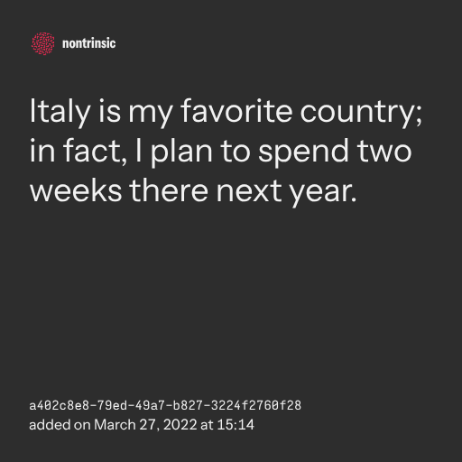 поделитьсяItaly is my favorite country; in fact, I plan to spend two weeks there next year.