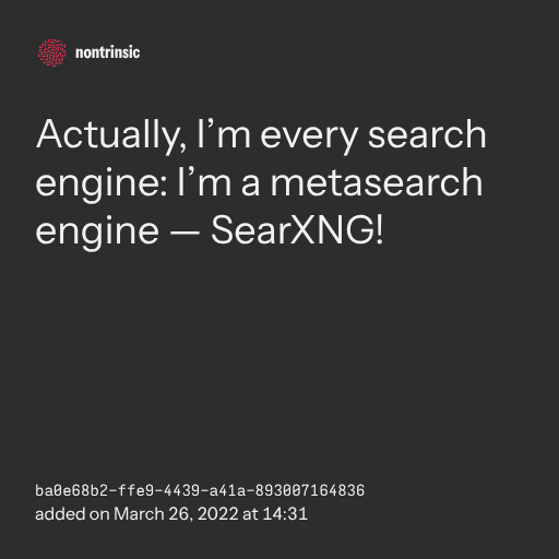 поделитьсяActually, I’m every search engine: I’m a metasearch engine — SearXNG!
