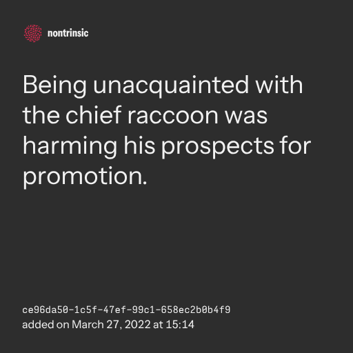 поделитьсяBeing unacquainted with the chief raccoon was harming his prospects for promotion.