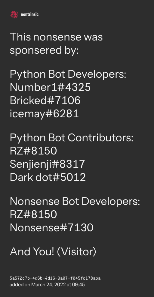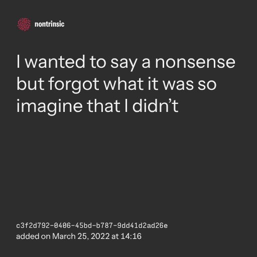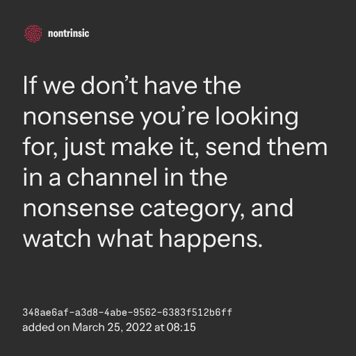 поделитьсяIf we don’t have the nonsense you’re looking for, just make it, send them in a channel in the nonsense category, and watch what happens.