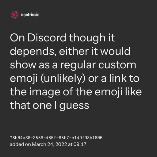 поделитьсяOn Discord though it depends, either it would show as a regular custom emoji (unlikely) or a link to the image of the emoji like that one I guess