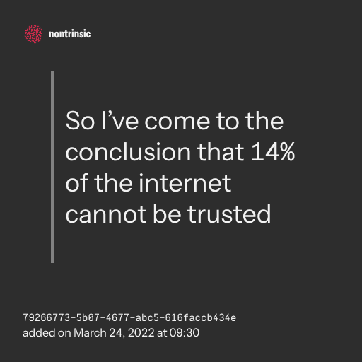 поделитьсяSo I’ve come to the conclusion that 14% of the internet cannot be trusted