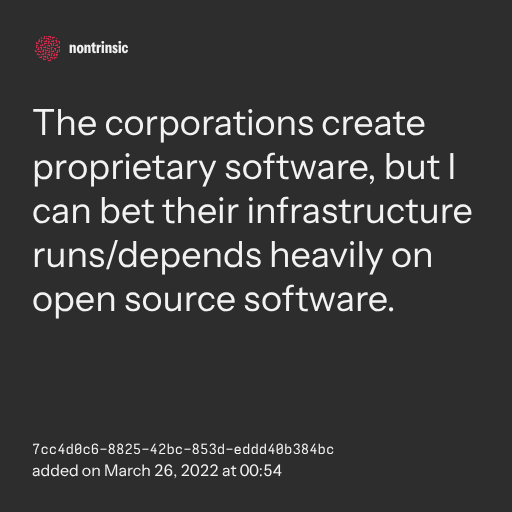 поделитьсяThe corporations create proprietary software, but I can bet their infrastructure runs/depends heavily on open source software.