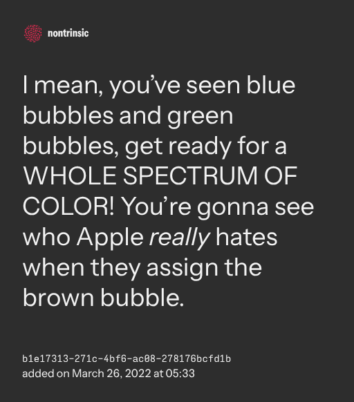 поделитьсяI mean, you’ve seen blue bubbles and green bubbles, get ready for a WHOLE SPECTRUM OF COLOR! You’re gonna see who Apple really hates when they assign the brown bubble.