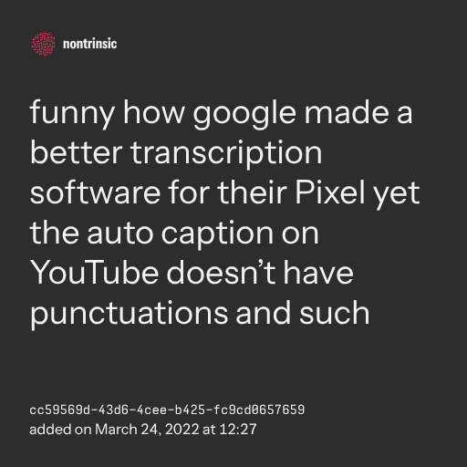 поделитьсяfunny how google made a better transcription software for their Pixel yet the auto caption on YouTube doesn’t have punctuations and such