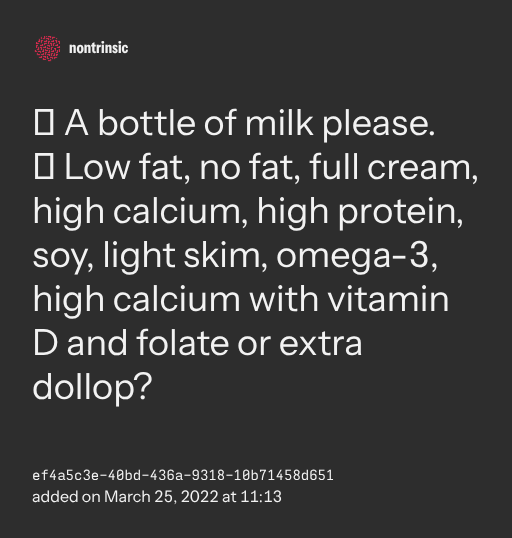 ● Low fat, no fat, full cream, high calcium, high protein, soy, light skim, omega-3, high calcium with vitamin D and folate or extra dollop?