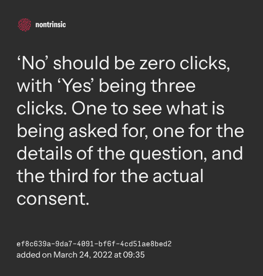 поделиться‘No’ should be zero clicks, with ‘Yes’ being three clicks. One to see what is being asked for, one for the details of the question, and the third for the actual consent.