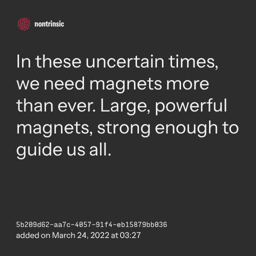 поделитьсяIn these uncertain times, we need magnets more than ever. Large, powerful magnets, strong enough to guide us all.