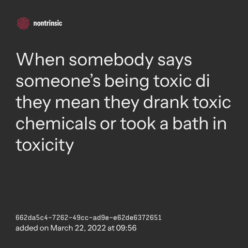 поделитьсяWhen somebody says someone’s being toxic di they mean they drank toxic chemicals or took a bath in toxicity