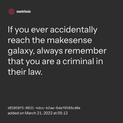 поделитьсяIf you ever accidentally reach the makesense galaxy, always remember that you are a criminal in their law.