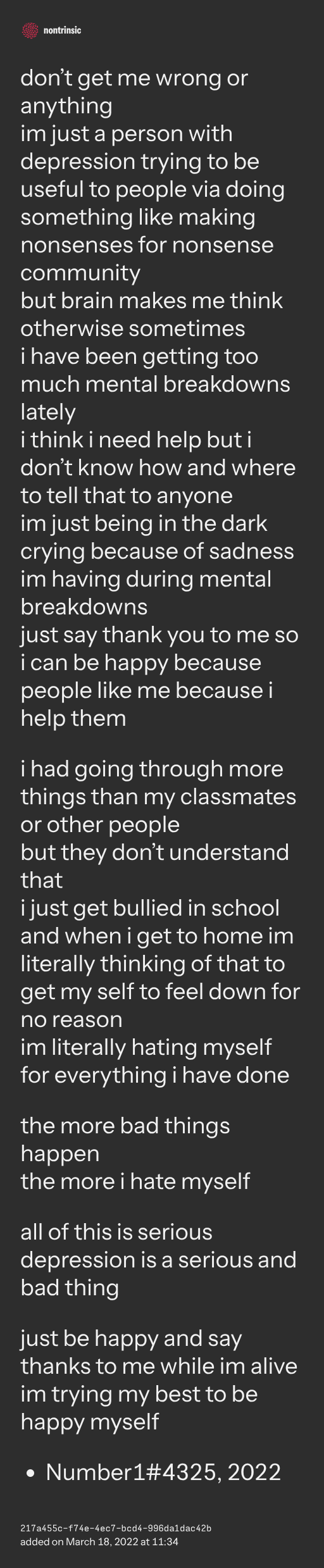 im just a person with depression trying to be useful to people via doing something like making nonsenses for nonsense community