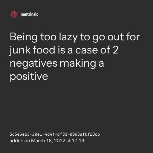поделитьсяBeing too lazy to go out for junk food is a case of 2 negatives making a positive