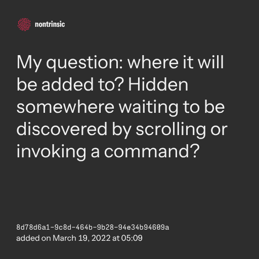 поделитьсяMy question: where it will be added to? Hidden somewhere waiting to be discovered by scrolling or invoking a command?