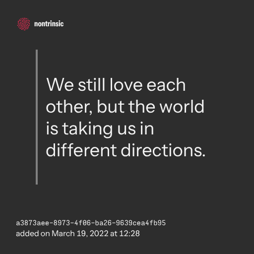 поделитьсяWe still love each other, but the world is taking us in different directions.