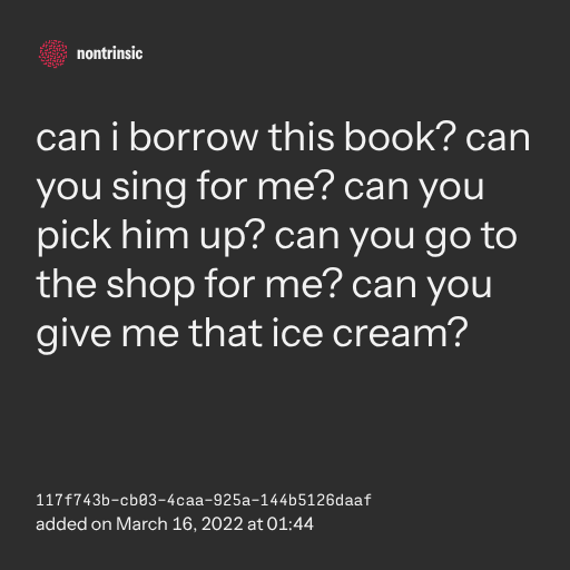 поделитьсяcan i borrow this book? can you sing for me? can you pick him up? can you go to the shop for me? can you give me that ice cream?