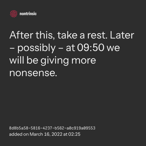 поделитьсяAfter this, take a rest. Later – possibly – at 09:50 we will be giving more nonsense.