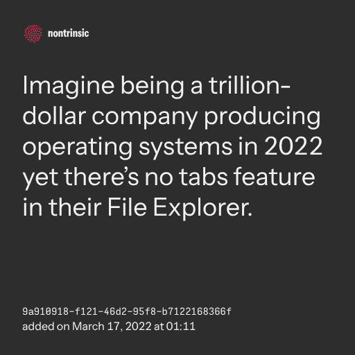 поделитьсяImagine being a trillion-dollar company producing operating systems in 2022 yet there’s no tabs feature in their File Explorer.