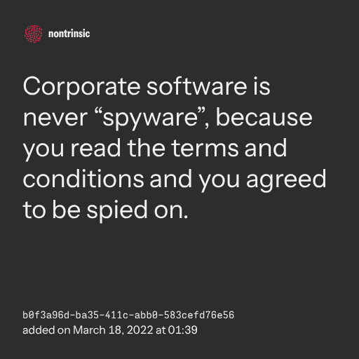 Corporate software is never “spyware”, because you read the terms and conditions and you agreed to be spied on.