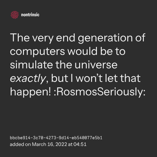 поделитьсяThe very end generation of computers would be to simulate the universe exactly, but I won’t let that happen! :RosmosSeriously: