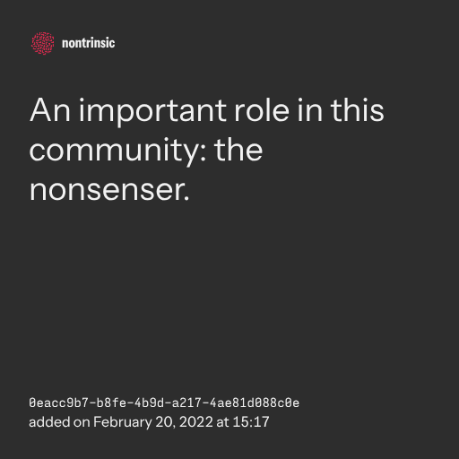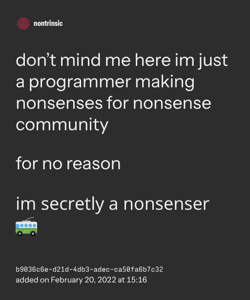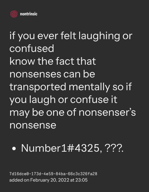 There’s a chance of getting your nonsense added to the nonsense database after you have sent your nonsense. Once added to the database, it will not be possible to remove or modify the nonsense. You can, however, delete or modify your already-sent nonsense before it gets added. An added nonsense will be marked with the ☑️ emoji below. Please go to the Nonsense section in our privacy policy for more details about what we’re doing with your nonsense.