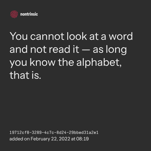 поделитьсяYou cannot look at a word and not read it — as long you know the alphabet, that is.