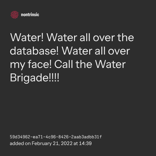 поделитьсяWater! Water all over the database! Water all over my face! Call the Water Brigade!!!!
