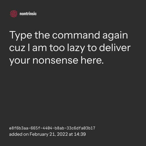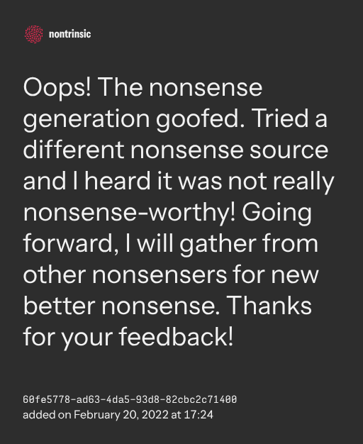 поделитьсяOops! The nonsense generation goofed. Tried a different nonsense source and I heard it was not really nonsense-worthy! Going forward, I will gather from other nonsensers for new better nonsense. Thanks for your feedback!