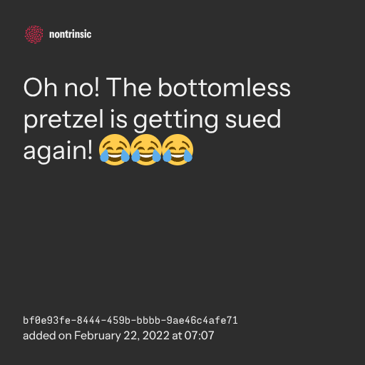 поделитьсяOh no! The bottomless pretzel is getting sued again! 😂😂😂