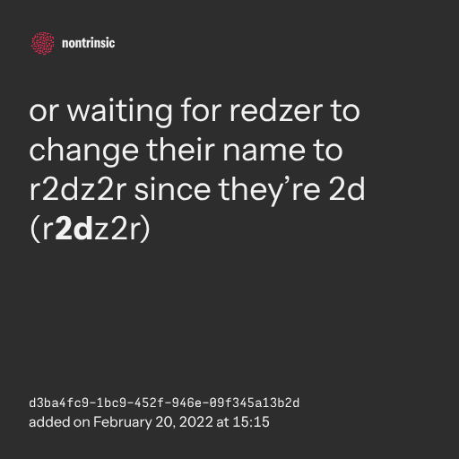 поделитьсяor waiting for redzer to change their name to r2dz2r since they’re 2d (r2dz2r)