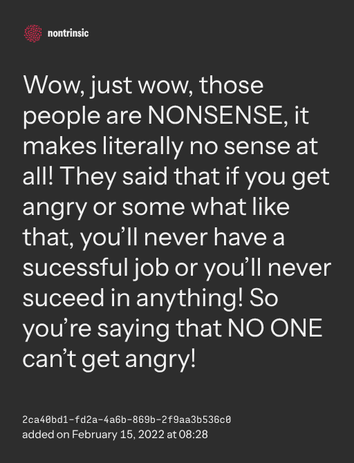 поделитьсяWow, just wow, those people are NONSENSE, it makes literally no sense at all! They said that if you get angry or some what like that, you’ll never have a sucessful job or you’ll never suceed in anything! So you’re saying that NO ONE can’t get angry!