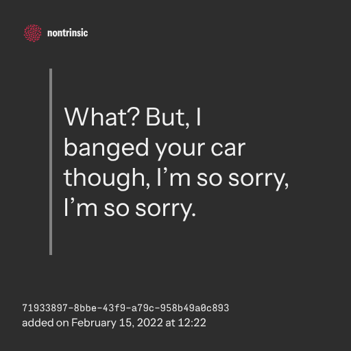 поделитьсяWhat? But, I banged your car though, I’m so sorry, I’m so sorry.
