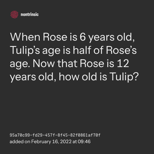 поделитьсяWhen Rose is 6 years old, Tulip’s age is half of Rose’s age. Now that Rose is 12 years old, how old is Tulip?