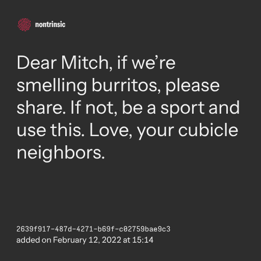 поделитьсяDear Mitch, if we’re smelling burritos, please share. If not, be a sport and use this. Love, your cubicle neighbors.
