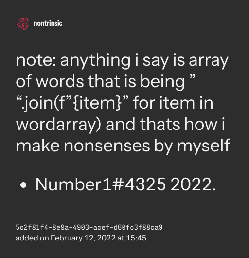 поделитьсяnote: anything i say is array of words that is being ” “.join(f”{item}” for item in wordarray) and thats how i make nonsenses by myself