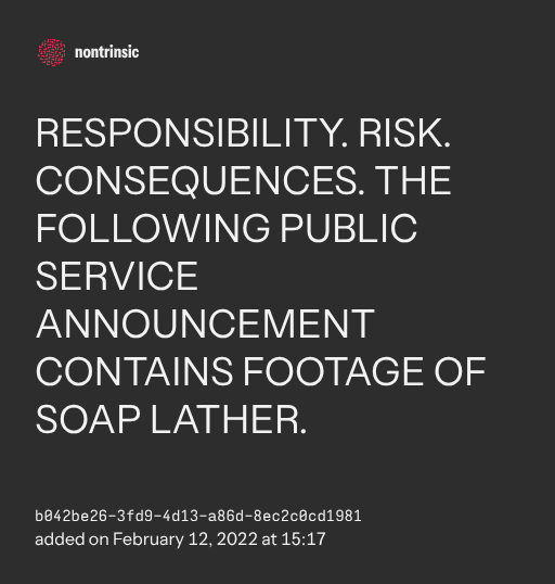 поделитьсяRESPONSIBILITY. RISK. CONSEQUENCES. THE FOLLOWING PUBLIC SERVICE ANNOUNCEMENT CONTAINS FOOTAGE OF SOAP LATHER.