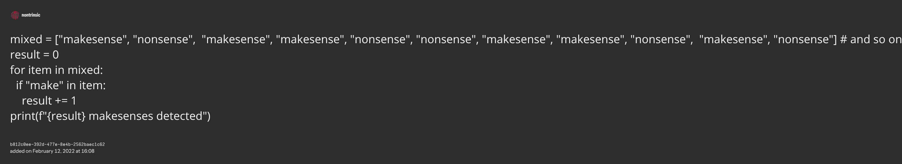 поделитьсяmixed = ["makesense", "nonsense", "makesense", "makesense", "nonsense", "nonsense", "makesense", "makesense", "nonsense", "makesense", "nonsense"] # and so on