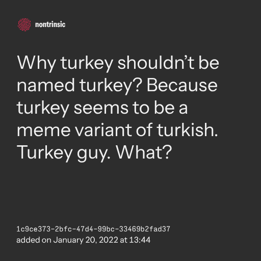 поделитьсяWhy turkey shouldn’t be named turkey? Because turkey seems to be a meme variant of turkish. Turkey guy. What?