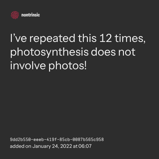 поделитьсяI’ve repeated this 12 times, photosynthesis does not involve photos!