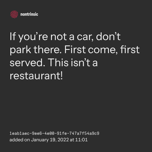 поделитьсяIf you’re not a car, don’t park there. First come, first served. This isn’t a restaurant!