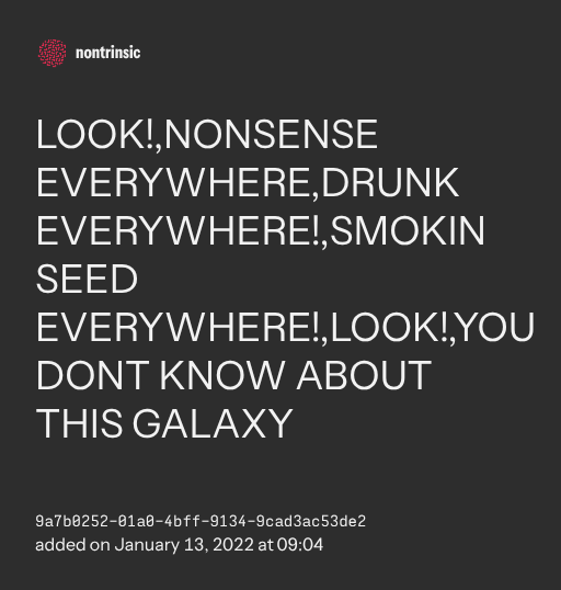 поделитьсяLOOK!,NONSENSE EVERYWHERE,DRUNK EVERYWHERE!,SMOKIN SEED EVERYWHERE!,LOOK!,YOU DONT KNOW ABOUT THIS GALAXY