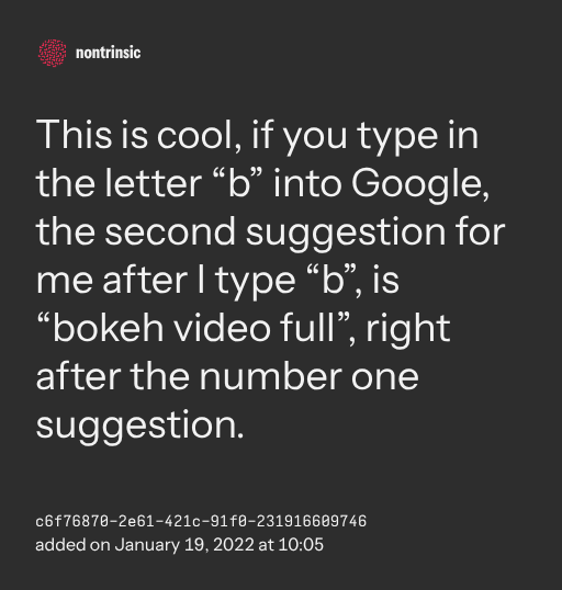 поделитьсяThis is cool, if you type in the letter “b” into Google, the second suggestion for me after I type “b”, is “bokeh video full”, right after the number one suggestion.