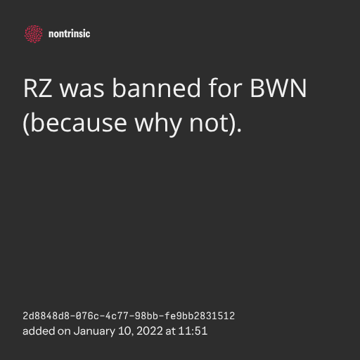 поделитьсяRZ was banned for BWN (because why not).